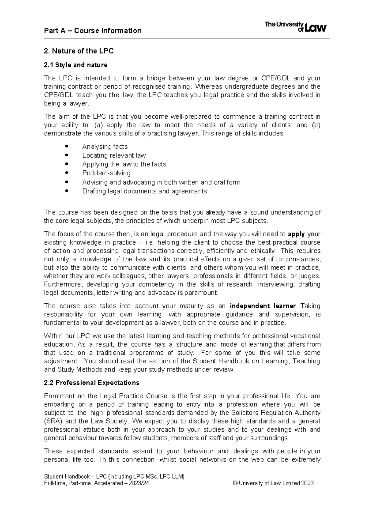 2. Nature of the LPC Part A Course Information 2. Nature of the LPC