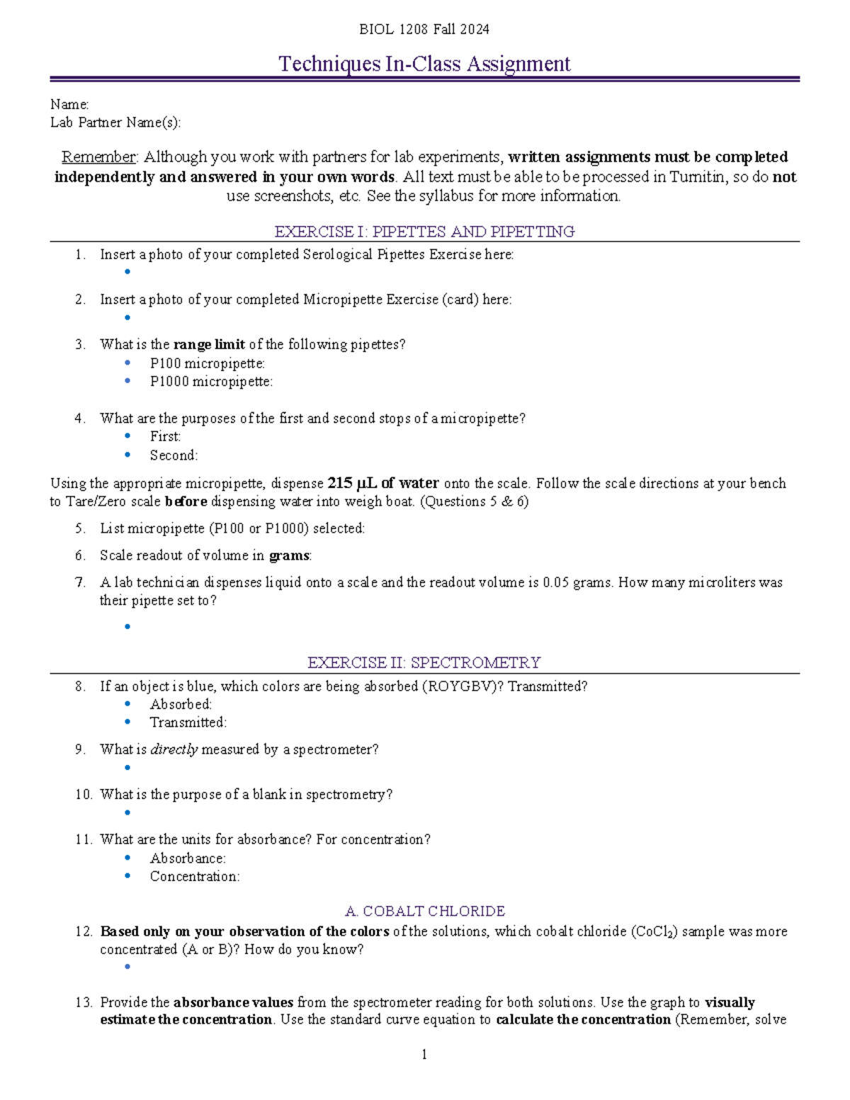 Techniques ICA LSU in class assignment on pipettes BIOL 1208 Fall