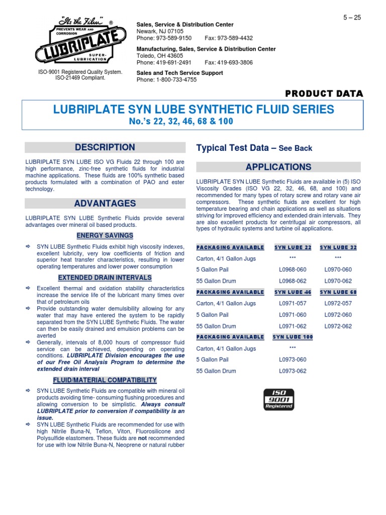 Lubriplate Syn Lube Synthetic Fluid Series Description Typical Test