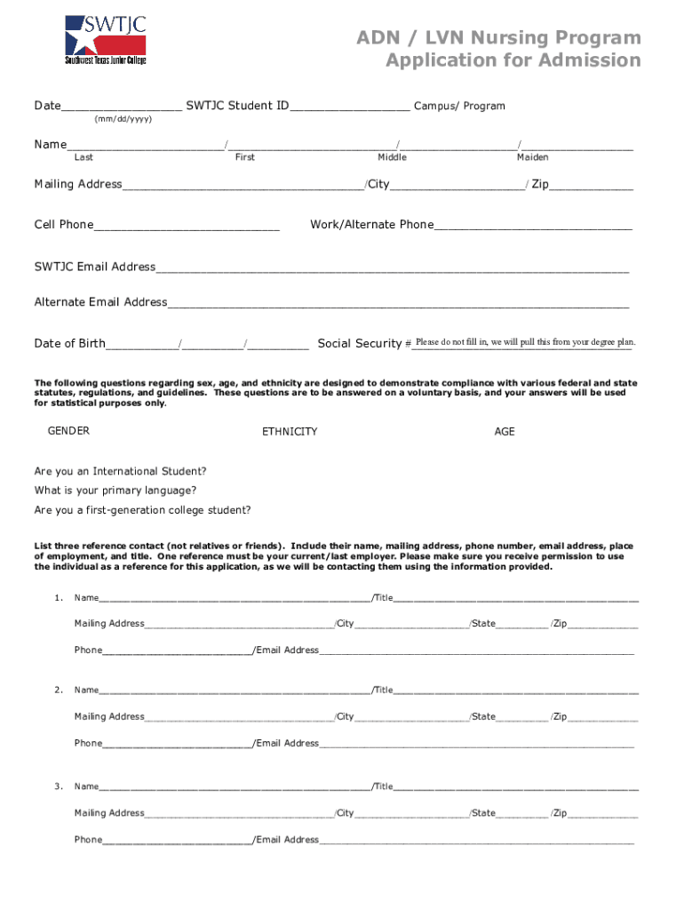 Fillable Online ADN/LVN Nursing Program Application for Admission Fax