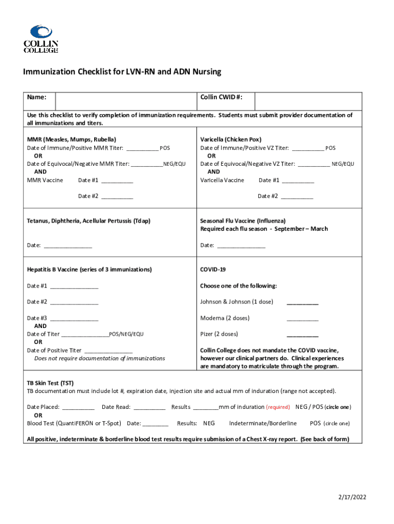 Fillable Online Immunization Checklist for LVNRN and ADN Nursing Fax