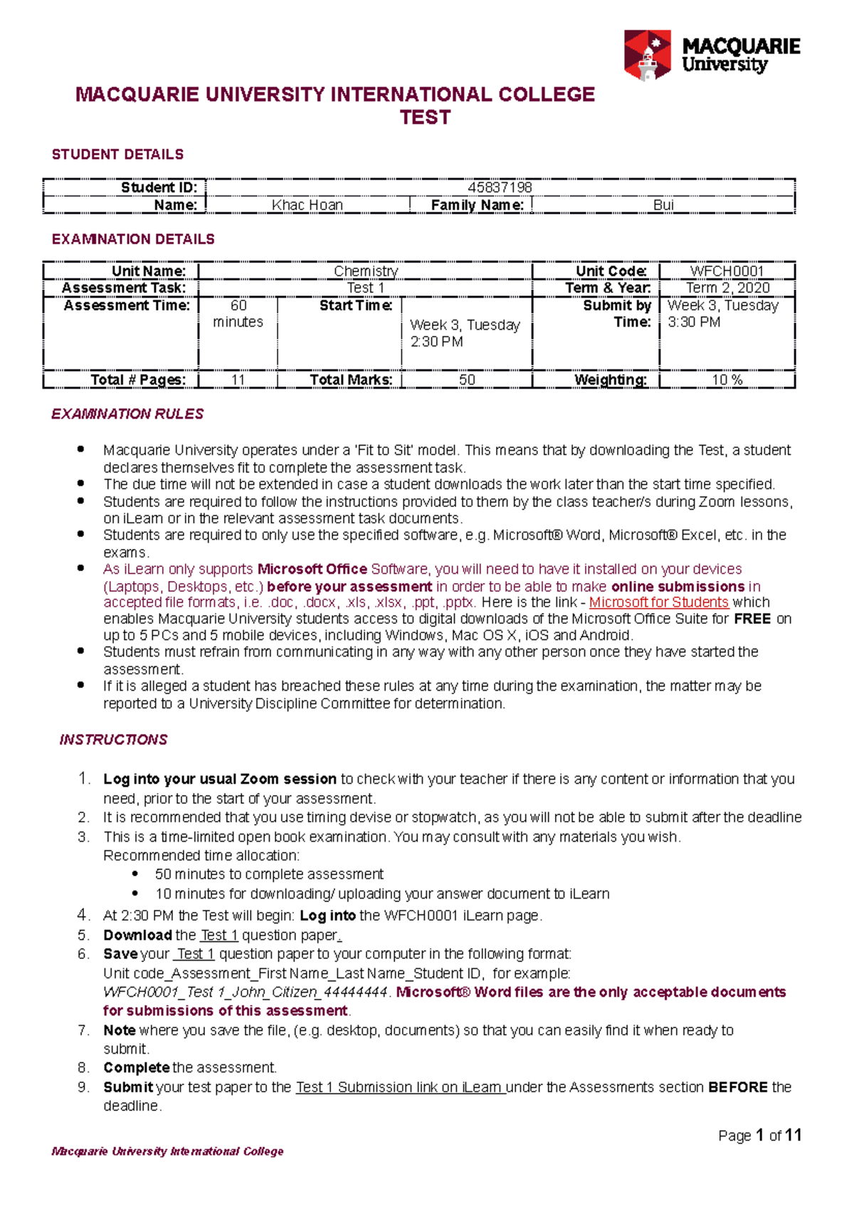 WFCH0001 Test 1 MACQUARIE UNIVERSITY INTERNATIONAL COLLEGE TEST