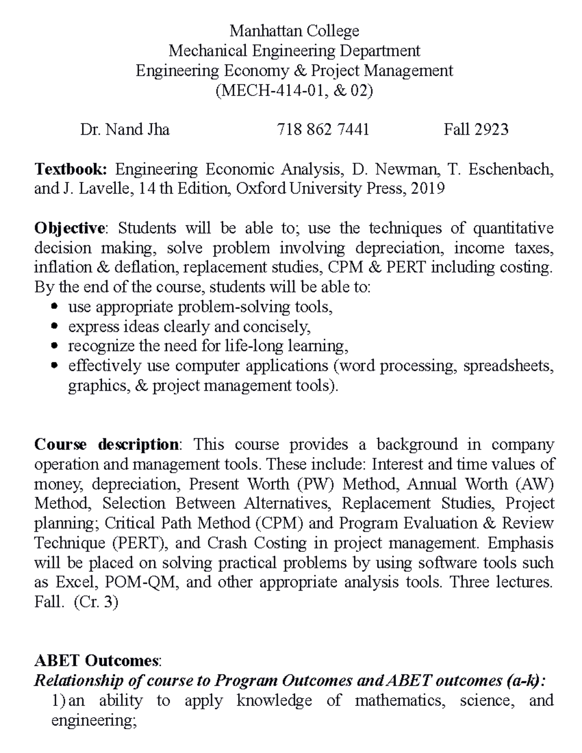 2023 Course outline MECH 414 Eng Eco 2023 (5) Manhattan College