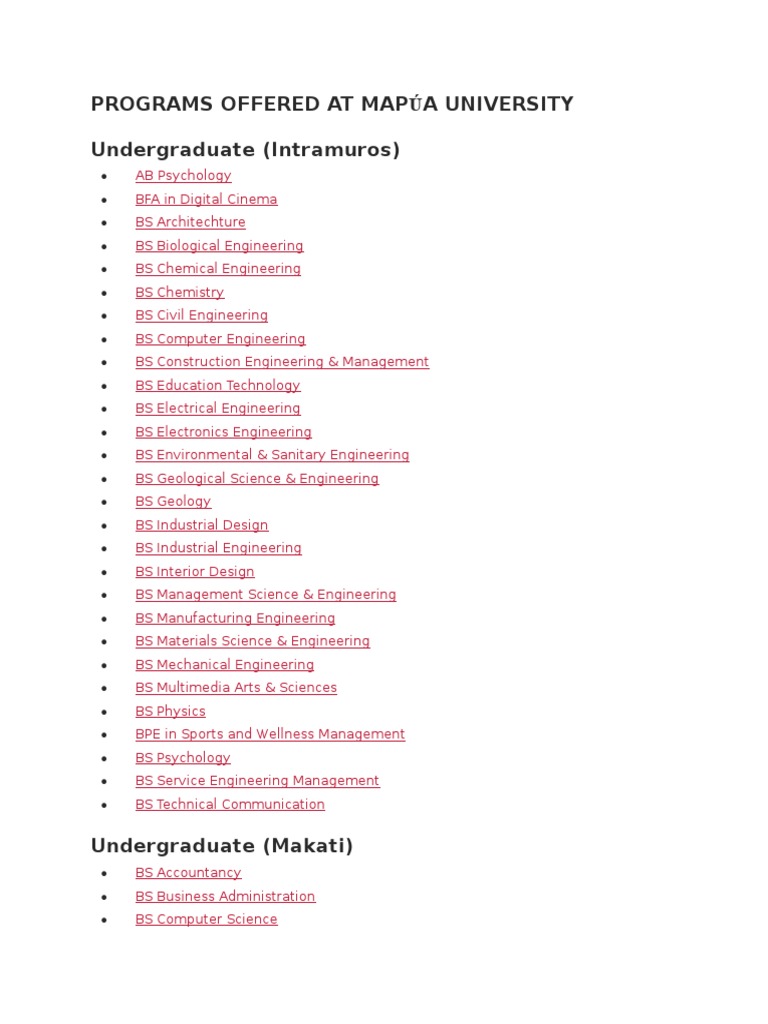 Programs Offered at Mapúa University PDF Engineering Academia