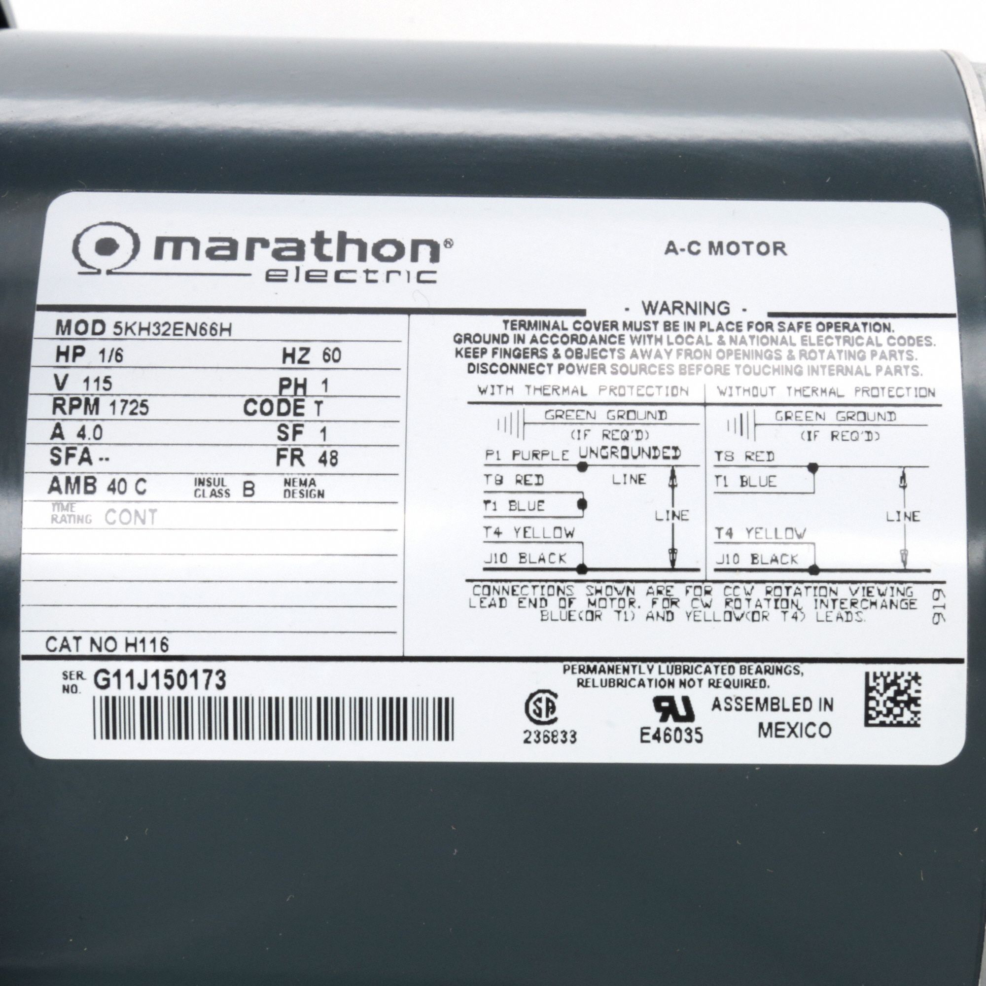 MARATHON MOTORS General Purpose Motor, 1/6 HP, SplitPhase, Nameplate
