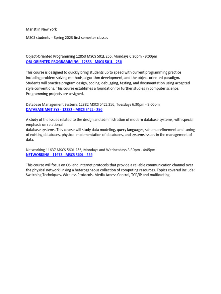 Marist MSCS Spring 2023 First Semester Courses PDF