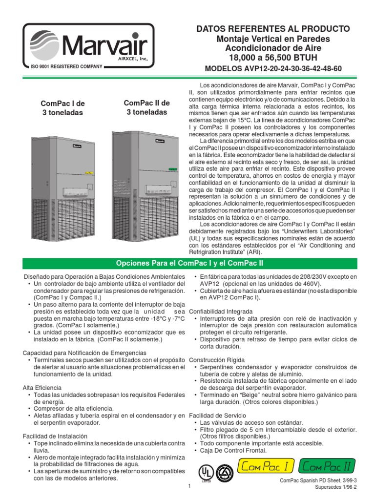 Datos Técnicos A/a Marvair ComPac I de 3 Toneladas ComPac II de 3