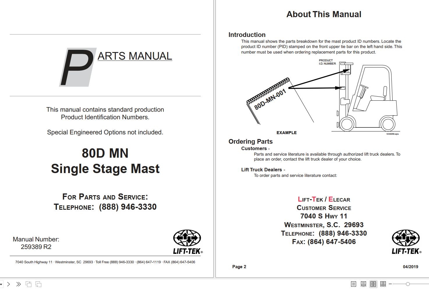 LiftTek 80DMN Single Stage Mast Parts Catalog 259389R2 PDF