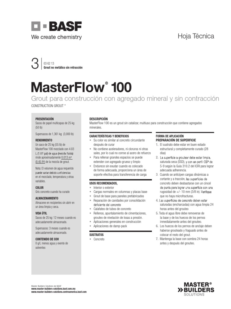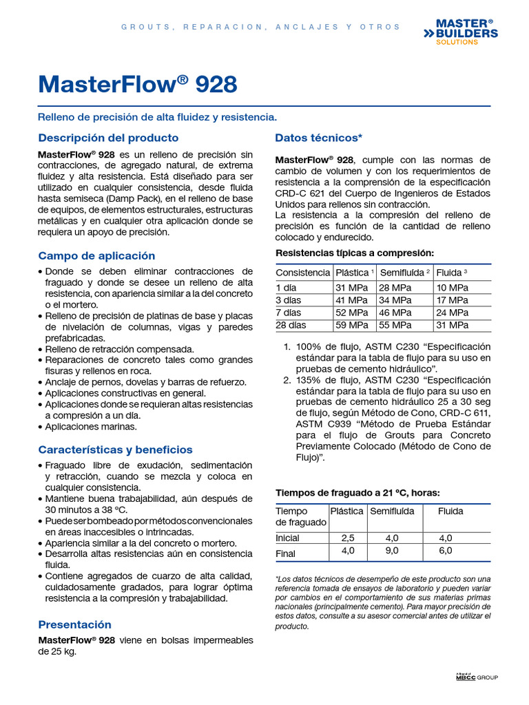 Masterflow 928 Ficha Técnica PDF Hormigón Cemento