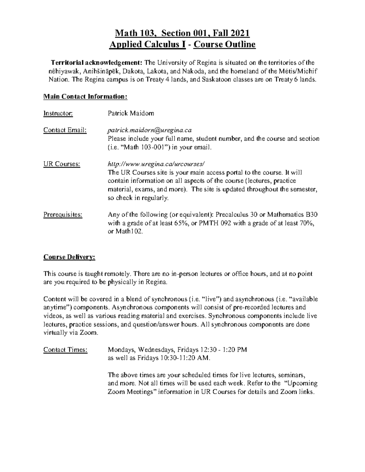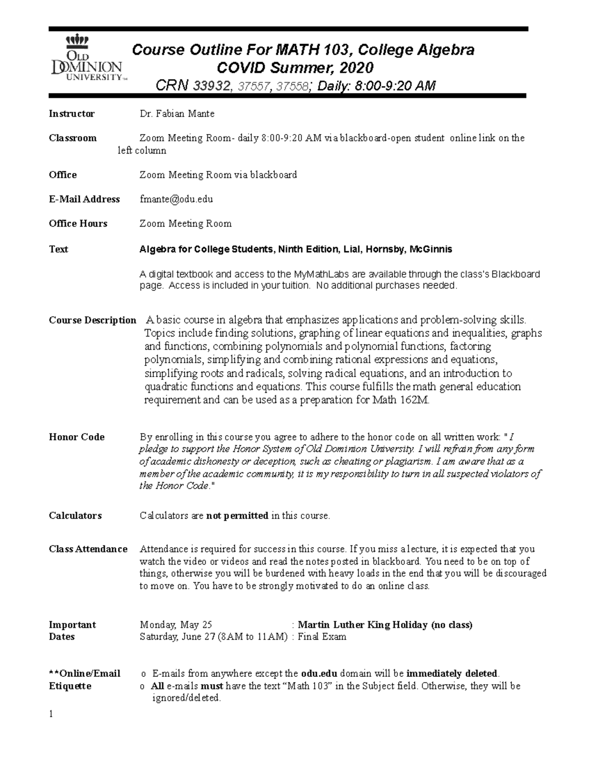 Math 103 syllabussummer 2020 Course Outline For MATH 103, College