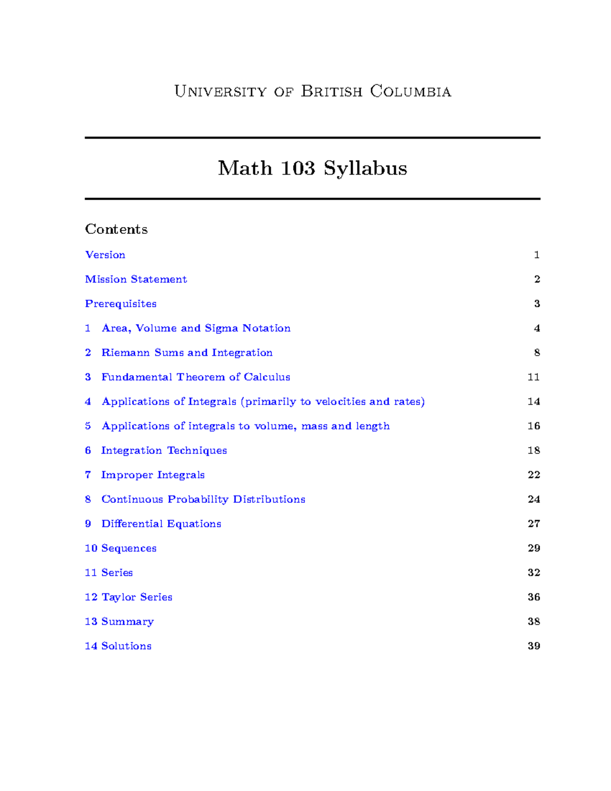 Syllabus aaa University of British Columbia Math 103 Syllabus