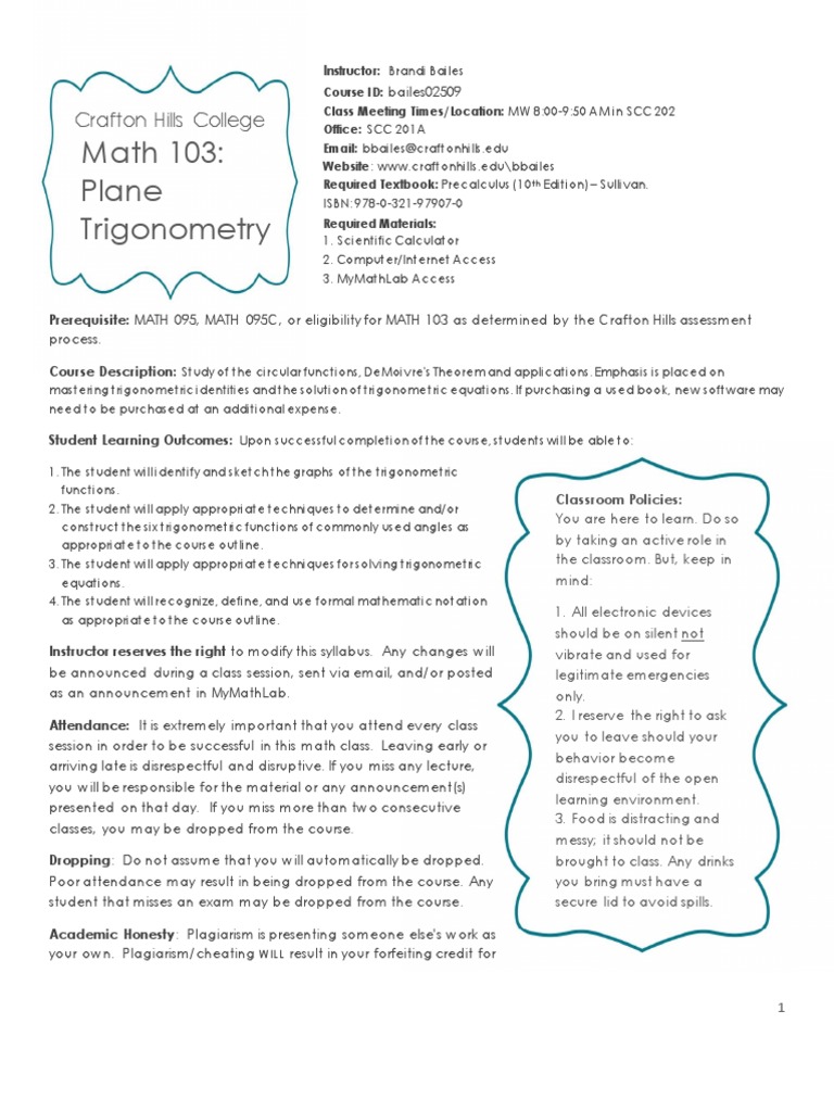 Math 103 Syllabus Spring 2016 PDF Trigonometric Functions
