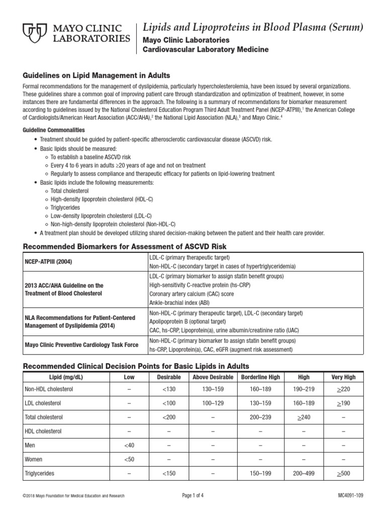 Lipids and Lipoproteins in Blood Plasma (Serum) Mayo Clinic
