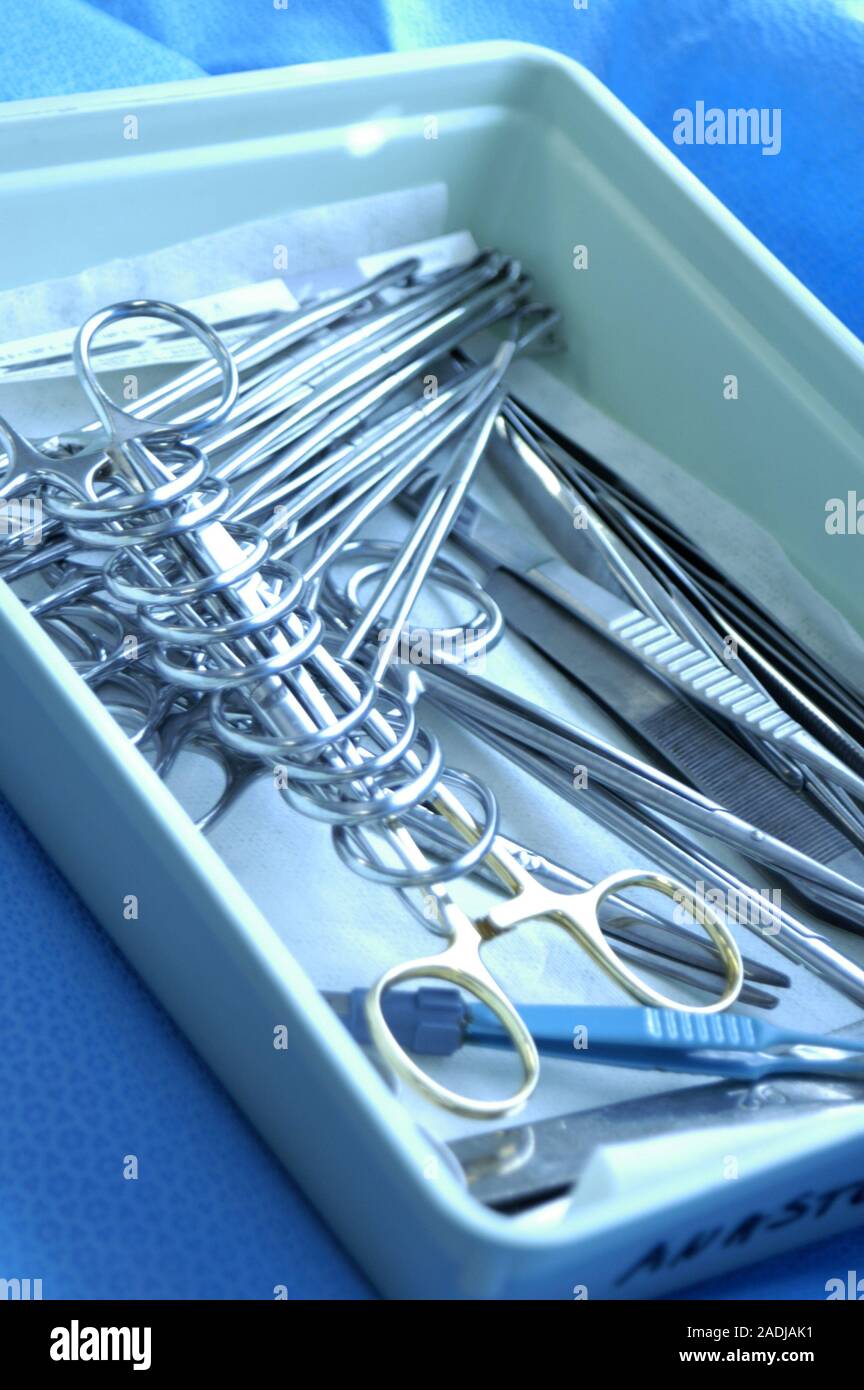 Sterilised equipment. Surgical and other medical equipment in a tray