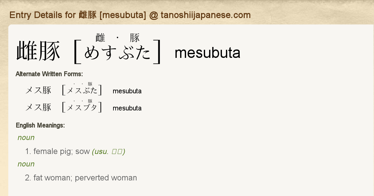 ![Entry Details for 雌豚 [mesubuta] Tanoshii Japanese](https://www.tanoshiijapanese.com/dictionary/entry_preview/1/196023/299627.png)
