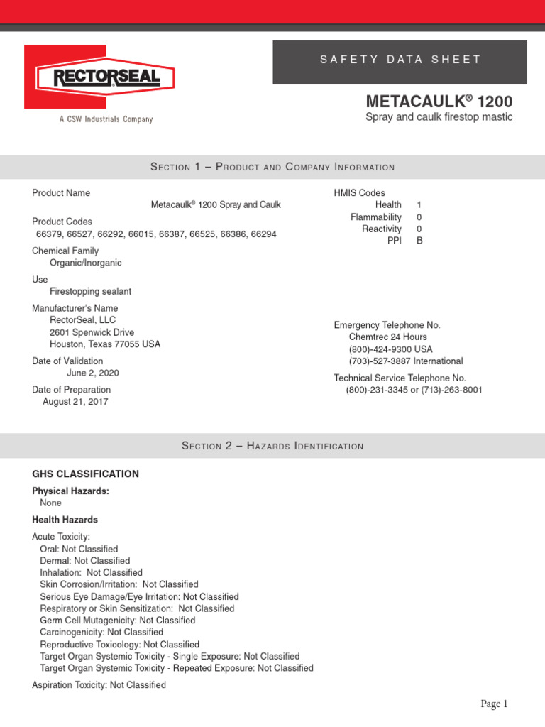Metacaulk 1200 Caulk Grade SDS 2091150 PDF Toxicity Waste