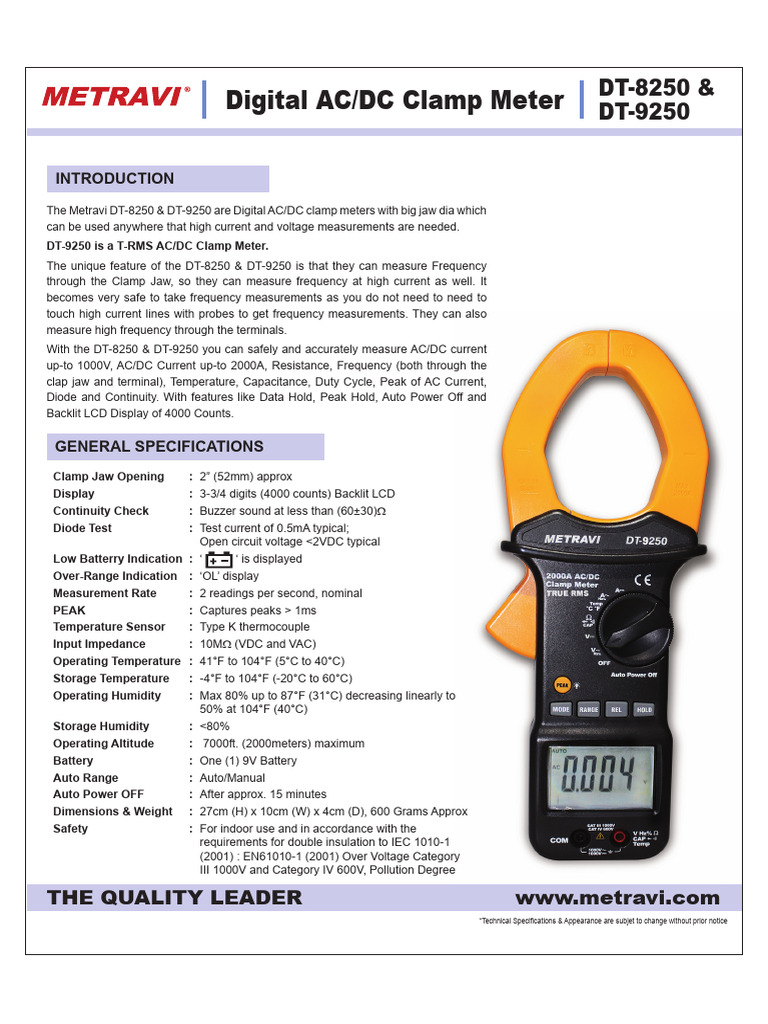 Metravi DT 9250 Digital AC DC Clamp Meter Catalogue PDF Electrical