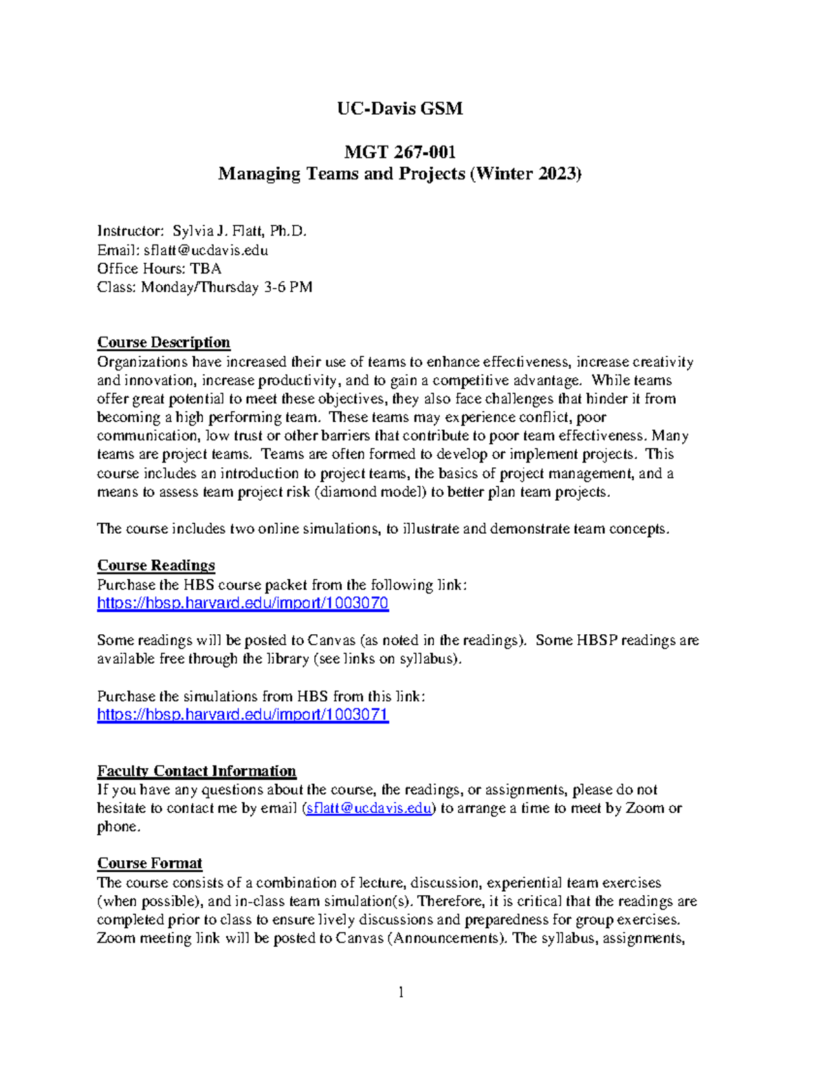 Syllabus MGT 267 (winter 2023) UCDavis GSM MGT 267 Managing Teams
