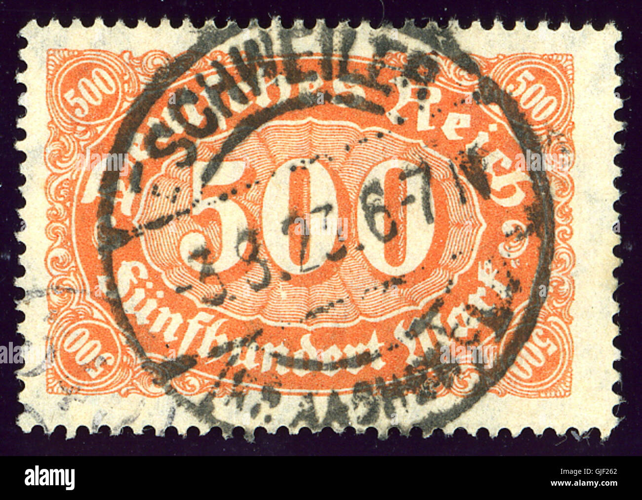 A 1923 German stamp, Michel catalog number 223, valued at 500 Mark