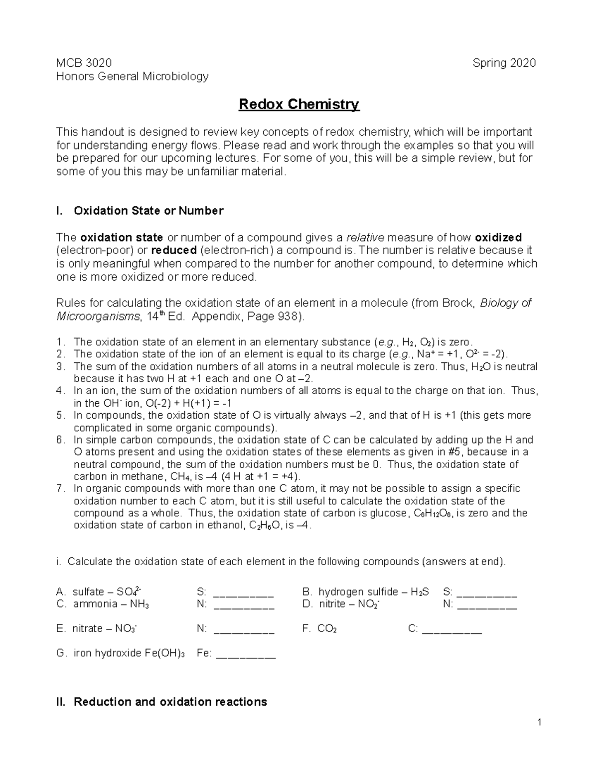 MCB 3020 Redox&Metabolism W12 MCB 3020 Spring 2020 Honors General