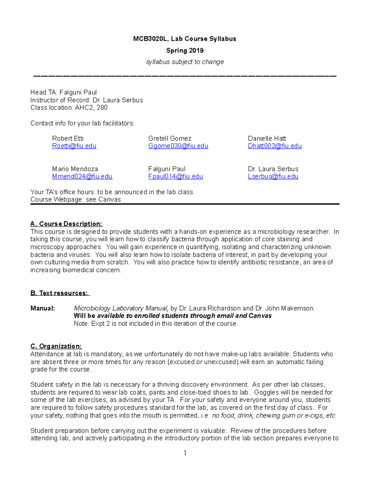 MCB 3020L Spring 2019 Syllabus MCB3020L, Lab Course Syllabus Spring