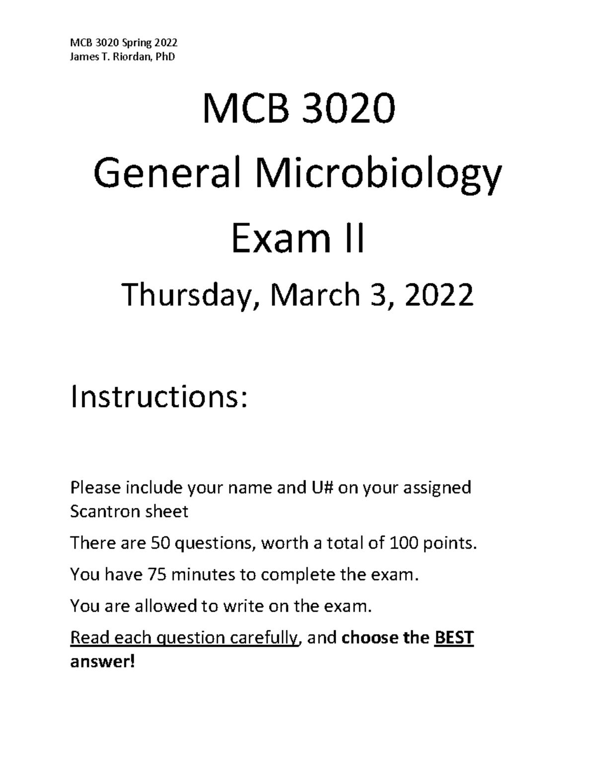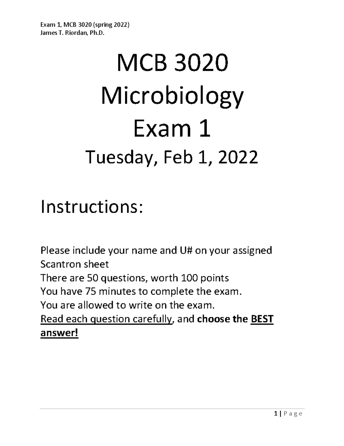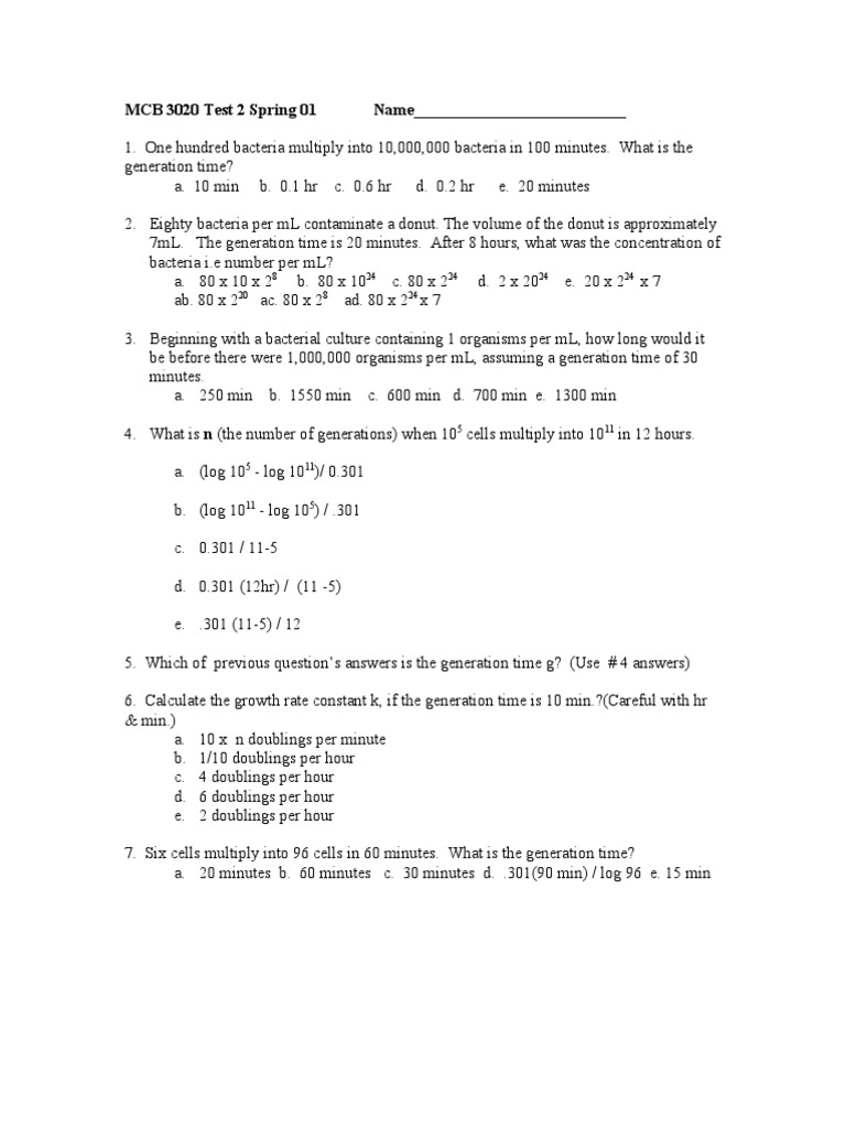 Sample Examination 1 on General Microbiology MCB 3020 Docsity