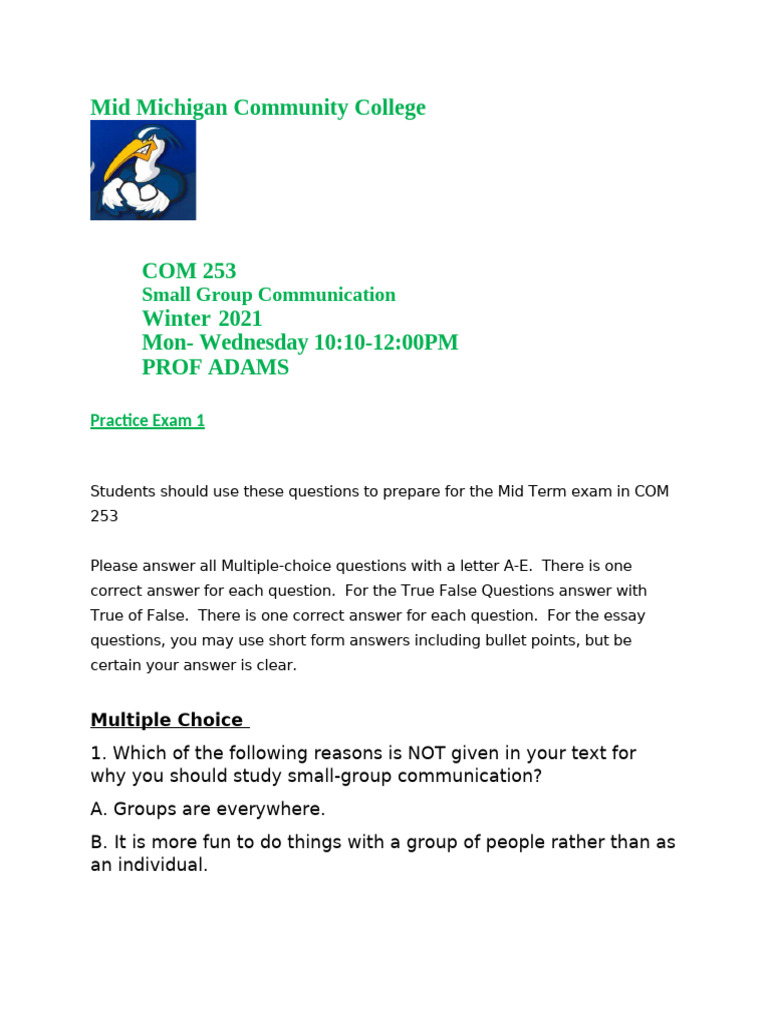 Practice Exam 1 COM 263 Small Group Communication Mid Michigan