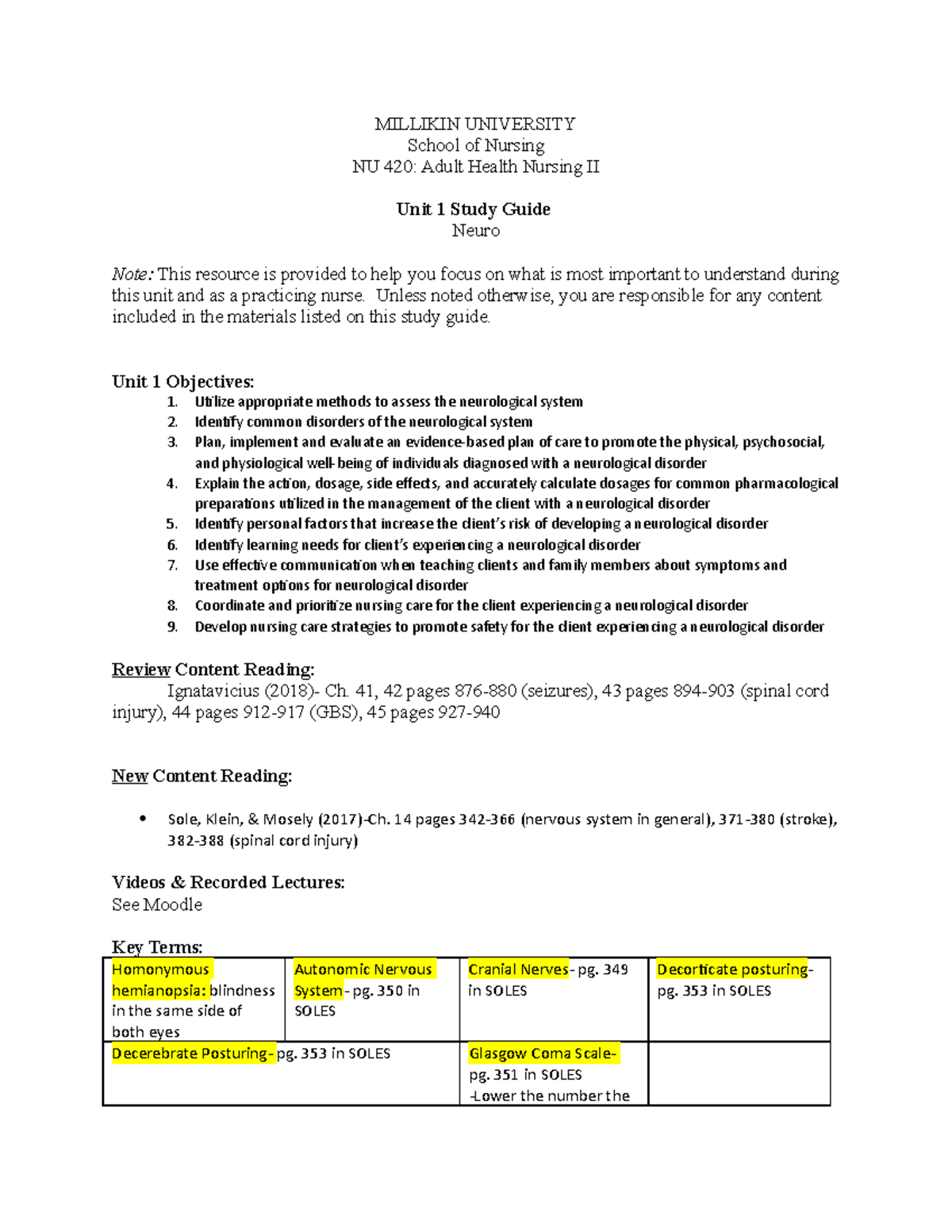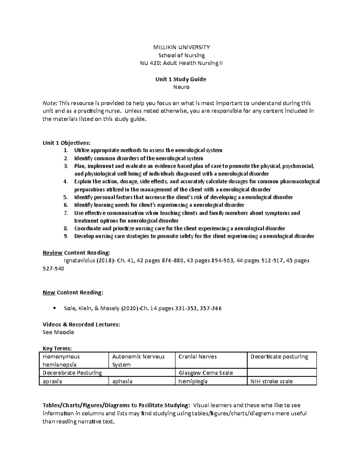Unit 1 study guide for test 1 MILLIKIN UNIVERSITY School of Nursing