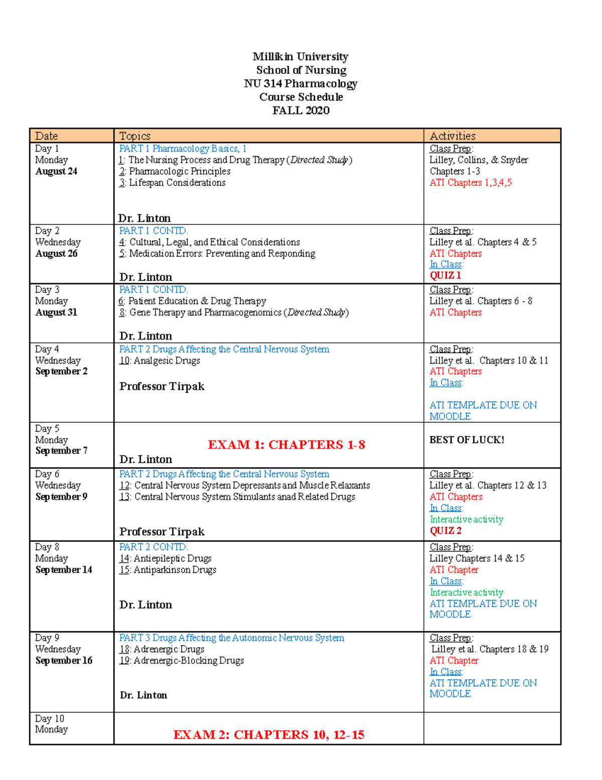FALL 2020 NU 314 Pharmacology Course Schedule Millikin University