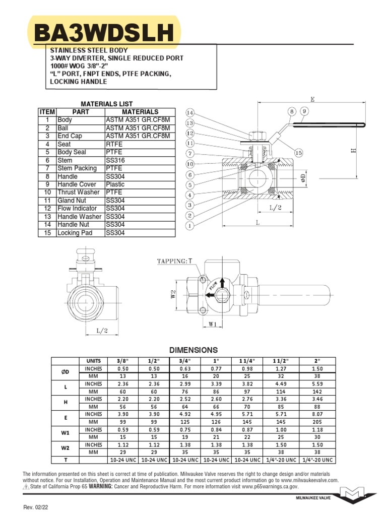 MILWAUKEE VALVE, 1 1/4 in, CF8M Stainless Steel, Manual ThreeWay Ball