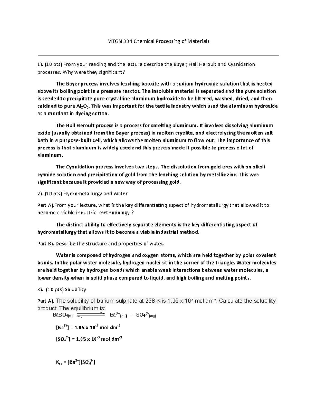 Mines MTGN 334 Chemical Processing Hydrometallurgy MTGN 334 Chemical