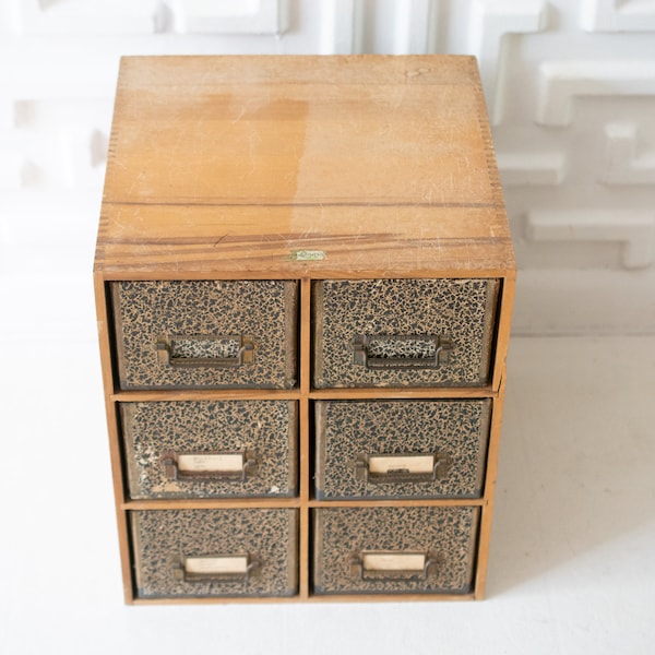 Antique Oak Card Catalog Wood Apothecary 6 Drawer Organizer Box