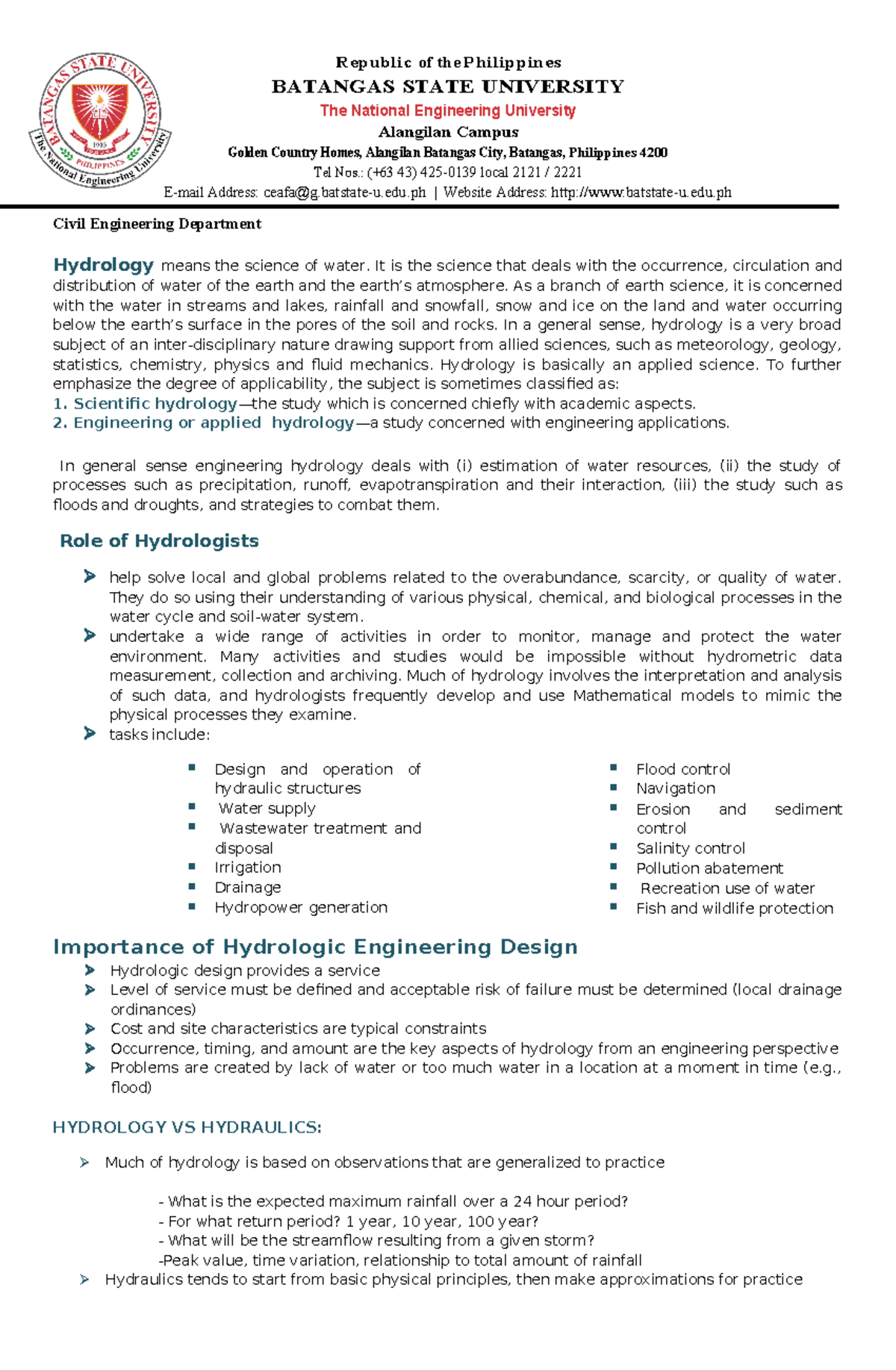 Hydrology Handouts Republic of the Philippines BATANGAS STATE
