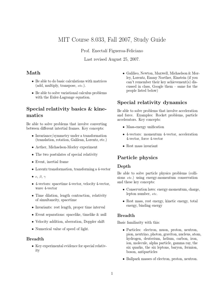 MIT Course 8.033, Fall 2007, Study Guide Prof. Enectal I Figueroa