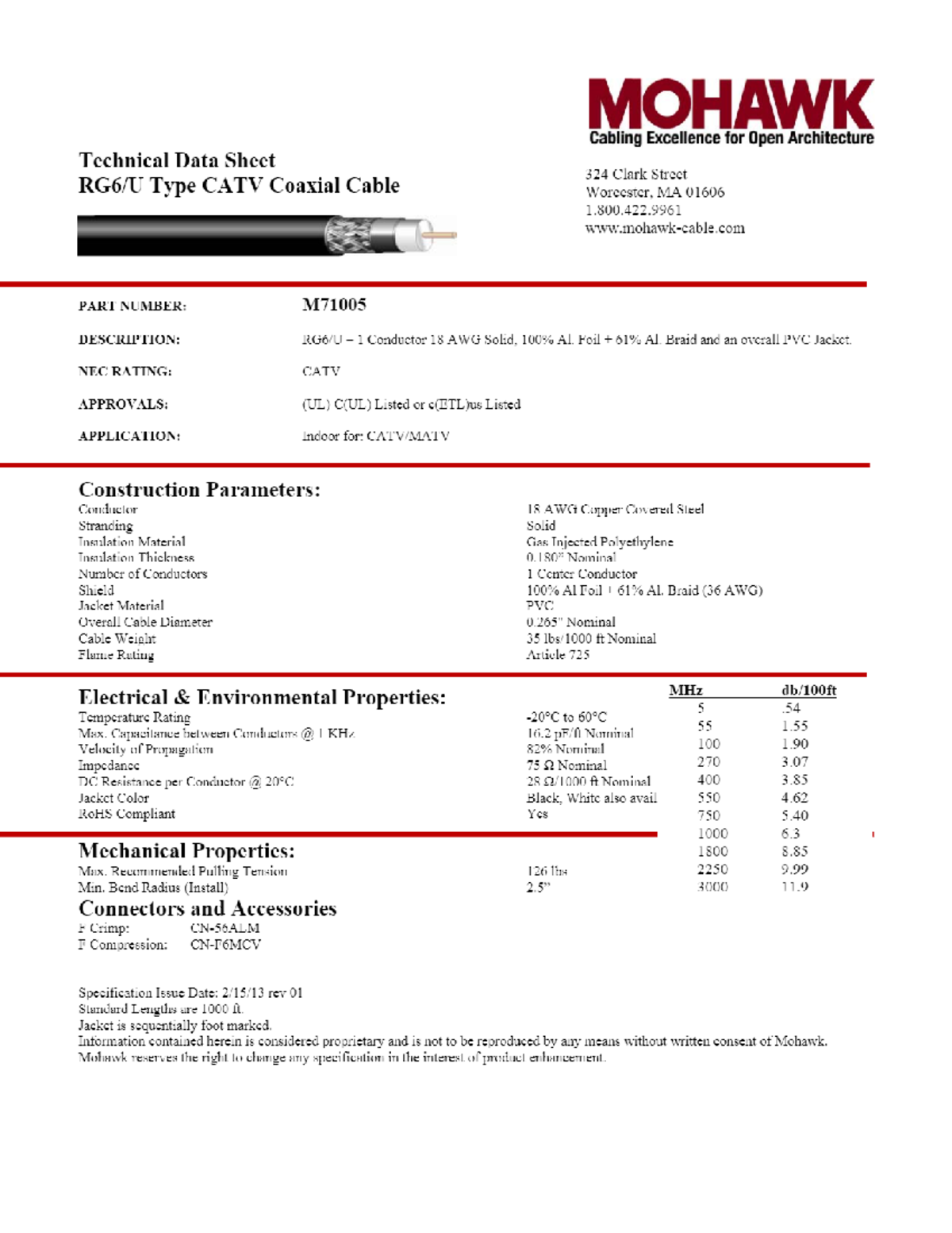 Technical Data Sheet RG6 U Type CATV Coaxial Cable MOHAWK Cabling