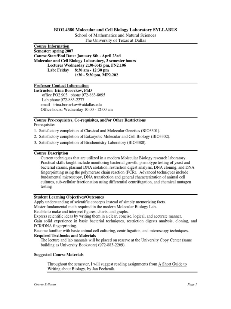 Molecular Biology Course Catalog Ut Dallas