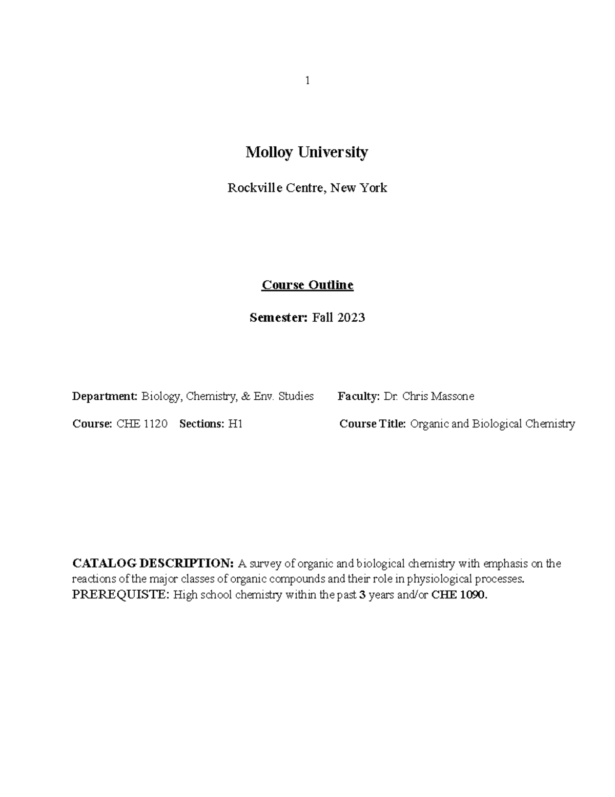 CHE 1120 H Lecture Syllabus Fall 23 1 Molloy University Rockville