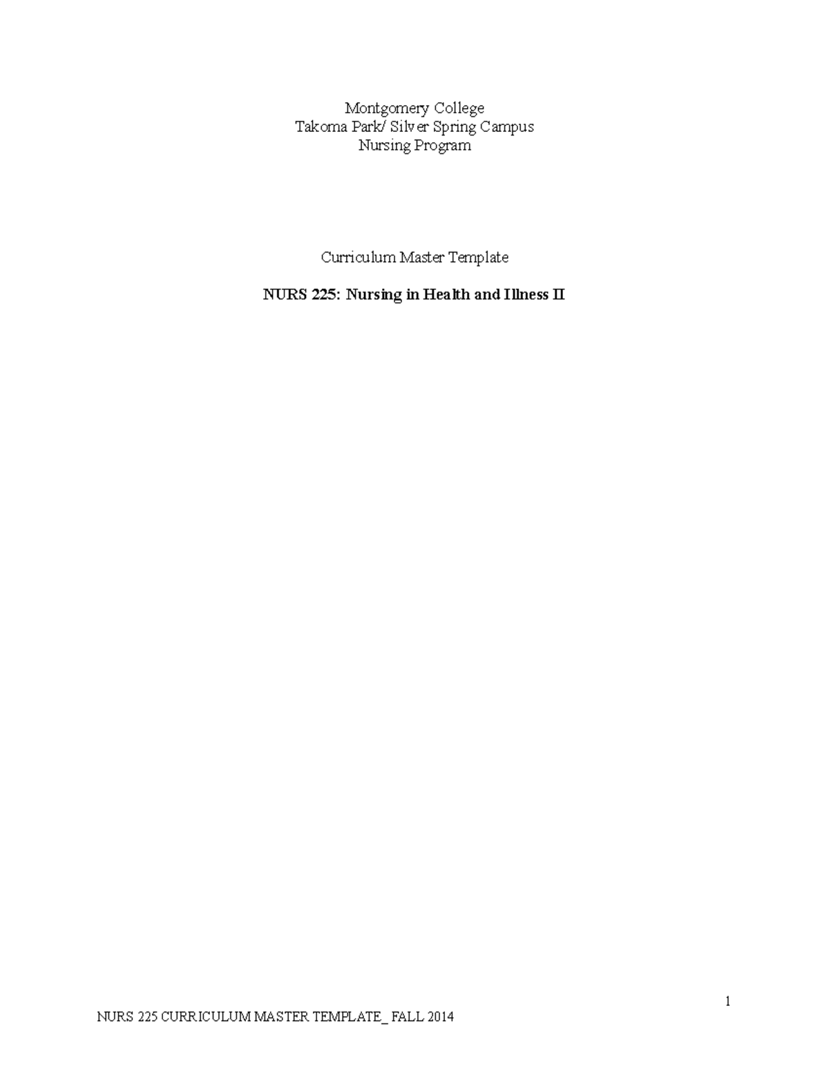 NURS 225 Curriculum Master Template Fall 2014 1 Montgomery College