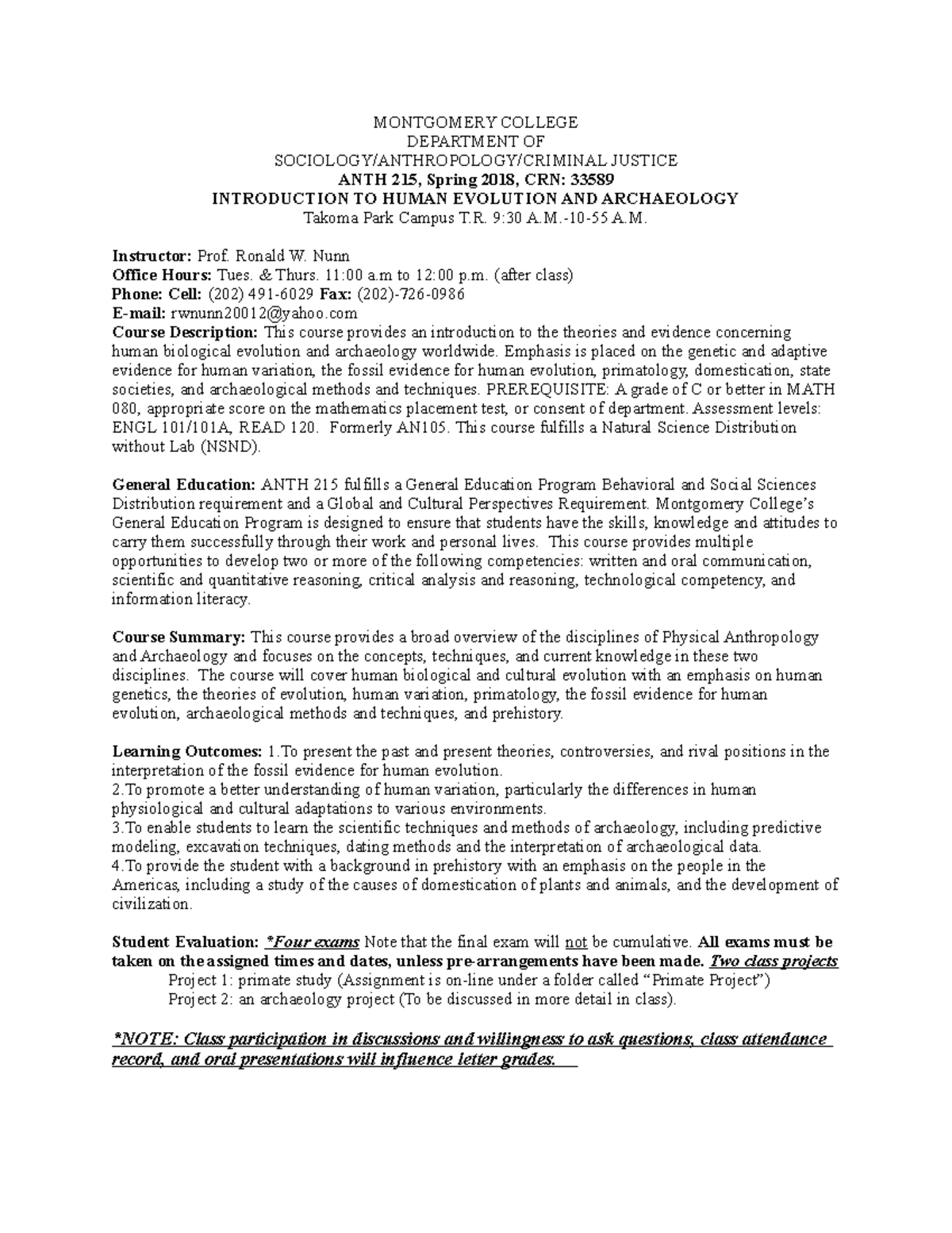Syllabus ANTH215 Spring 18 TR Takoma Park MONTGOMERY COLLEGE