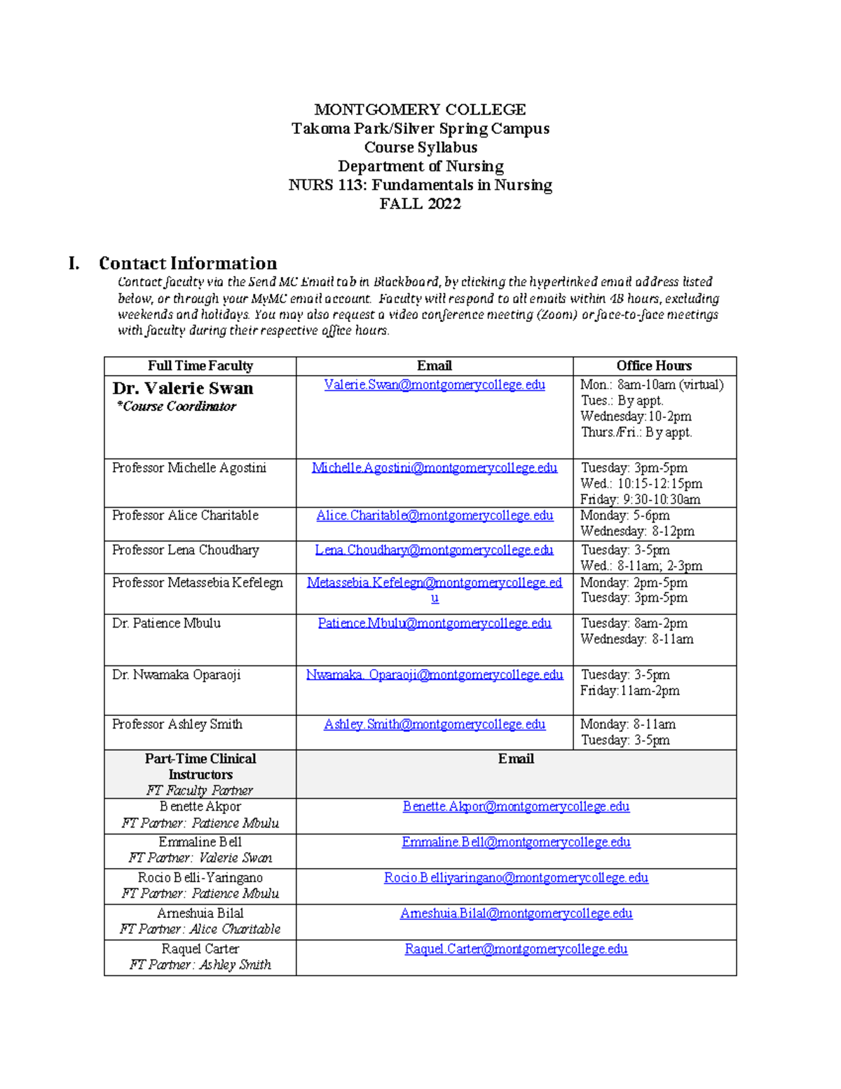 NURS 113 Syllabus Fall 2022 Final Version MONTGOMERY COLLEGE Takoma