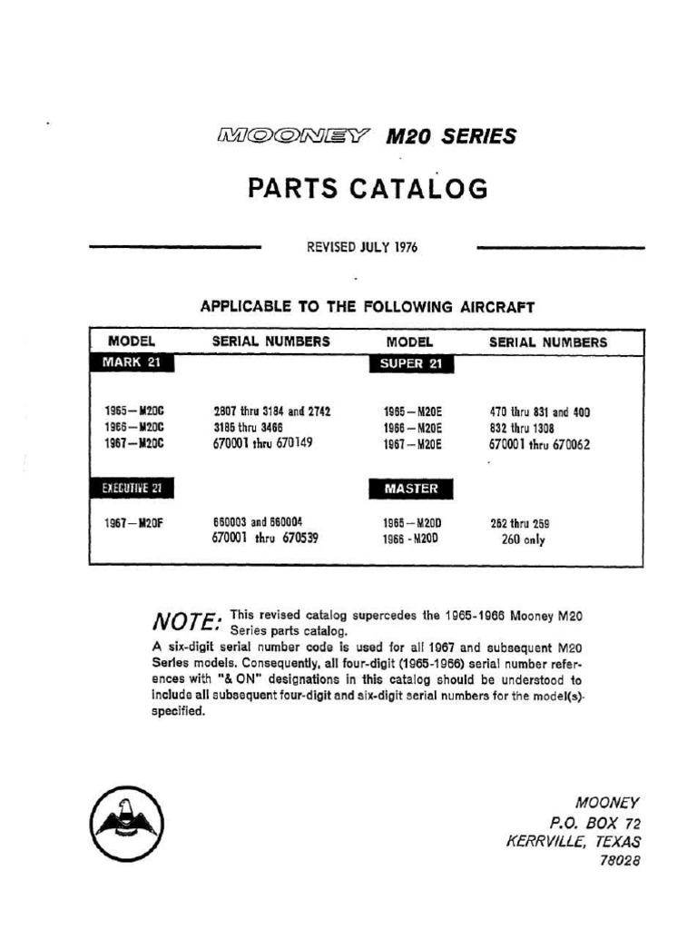 Mooney M20 Series M20C M20E M20F M20G Illustrated Parts Catalog Manual