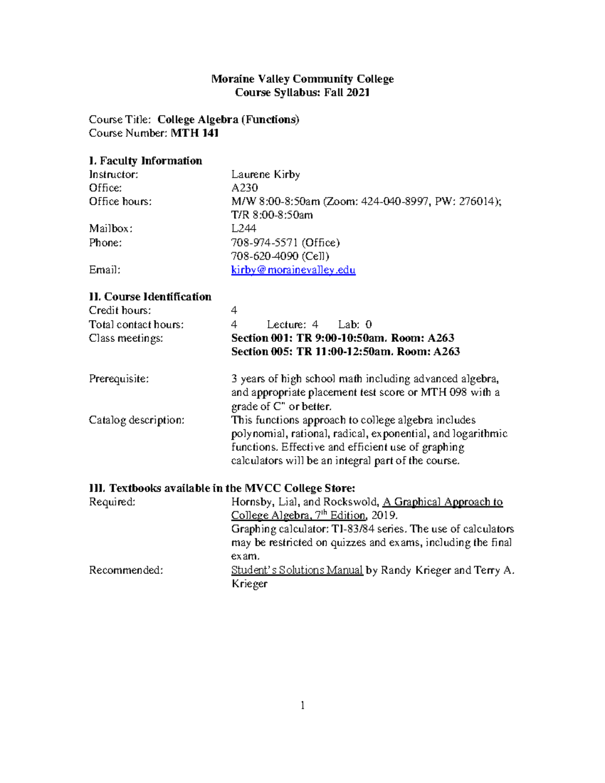 MTH141 Syllabus TR fa21 rvsd1 Moraine Valley Community College