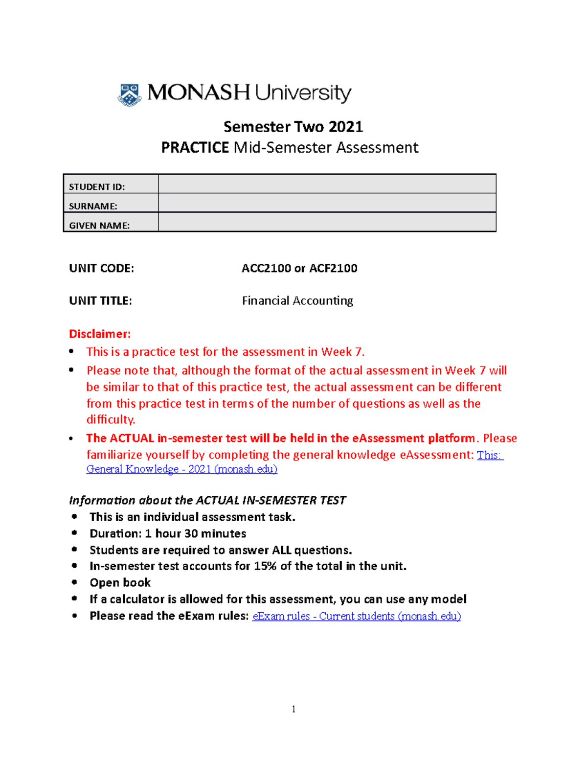ACC ACF2100 Practice MST Sem 2 2021 Semester Two 2021 PRACTICE Mid