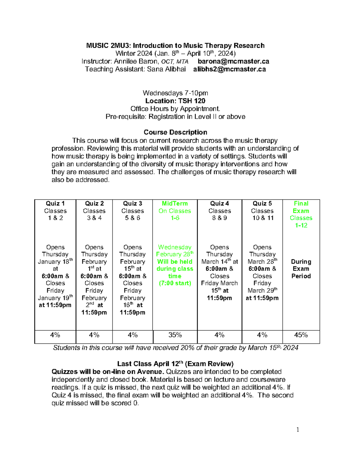 2MU3 Course Outline 2024 MUSIC 2MU3 Introduction to Music Therapy