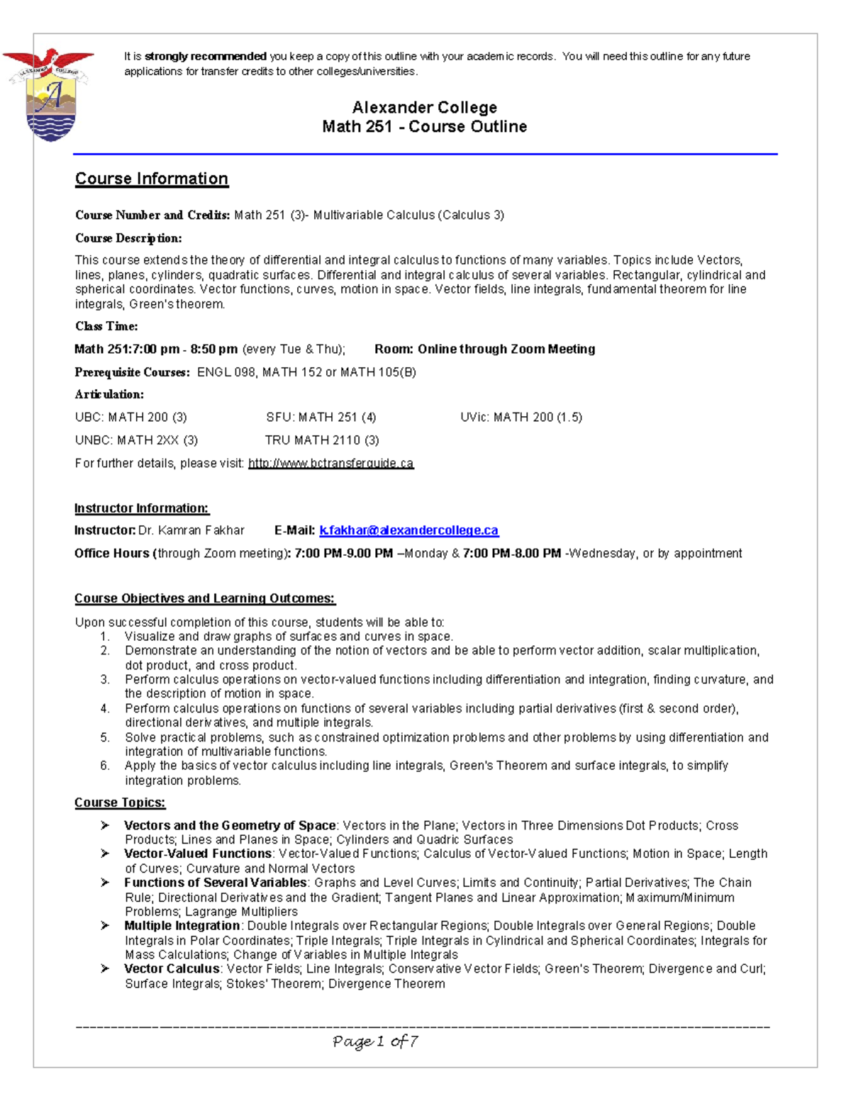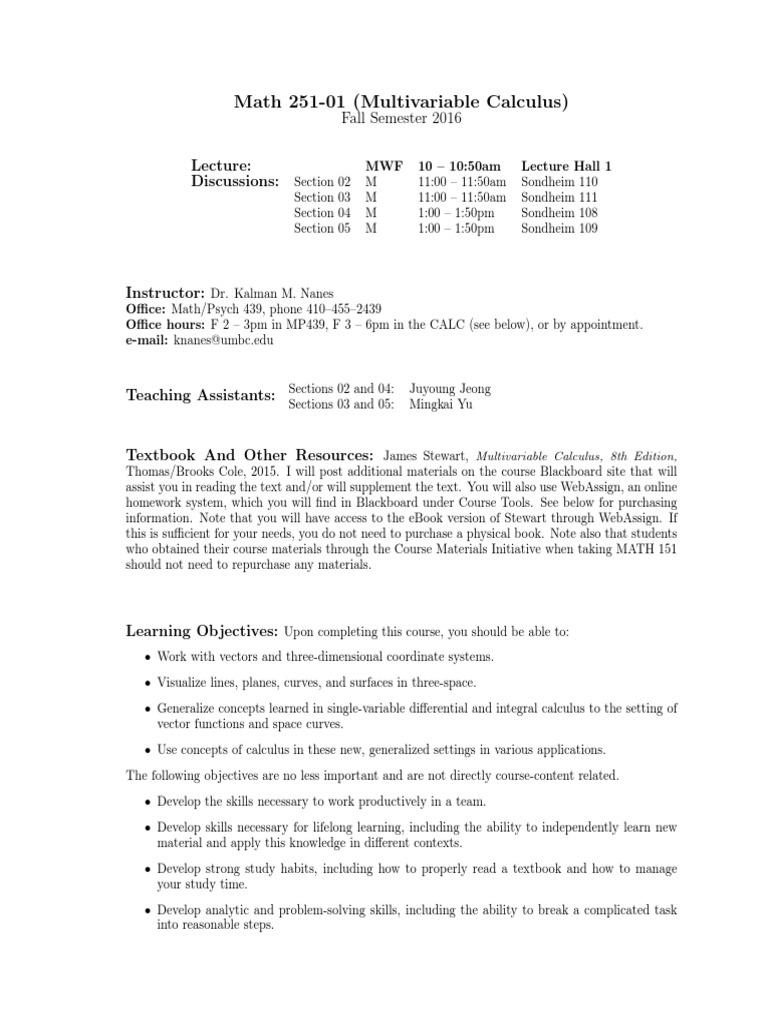 Math 25101 (Multivariable Calculus) Fall Semester 2016 PDF