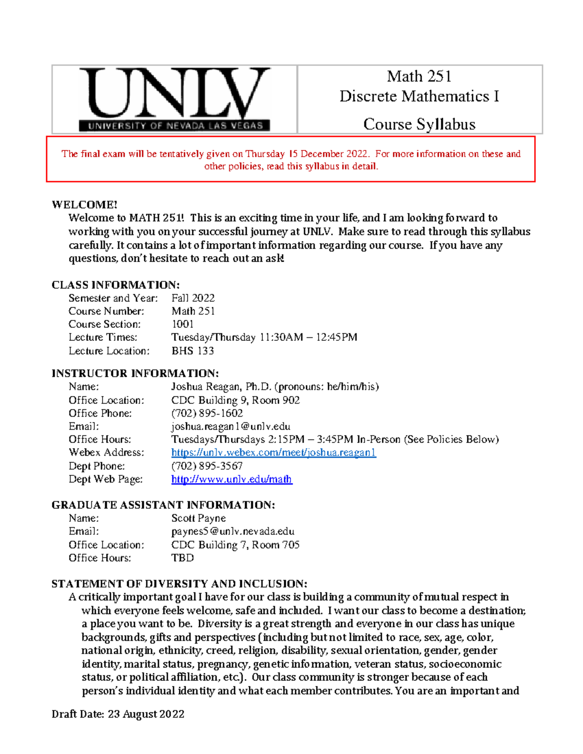 Math 251.1001 Syllabus Fall 2022 Math 251 Discrete Mathematics I