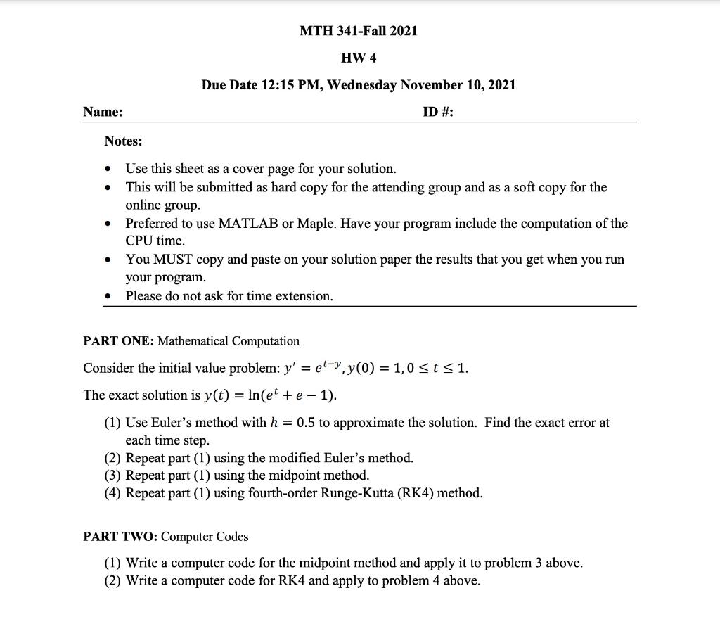Solved MTH 341Fall 2021 HW 4 Due Date 1215 PM, Wednesday