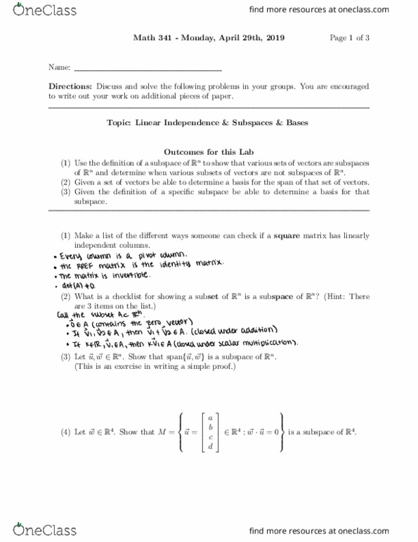 MLC Computer Lab Visit 1 Linear Algebra I MTH 341 Docsity