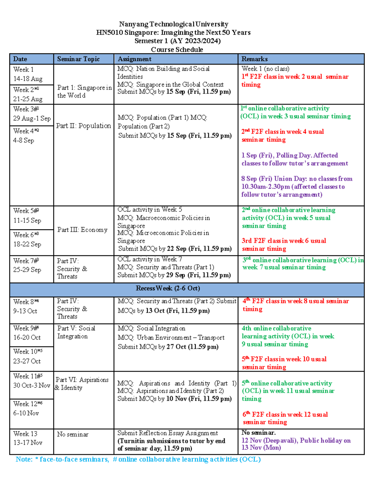 HN5010 Course Schedule (AugNov 23) Nanyang Technological University