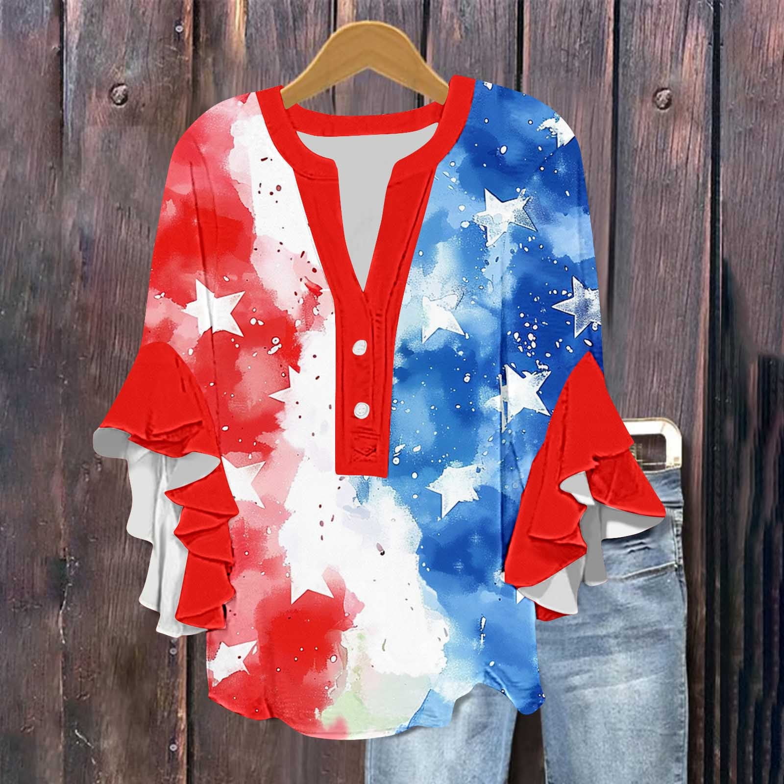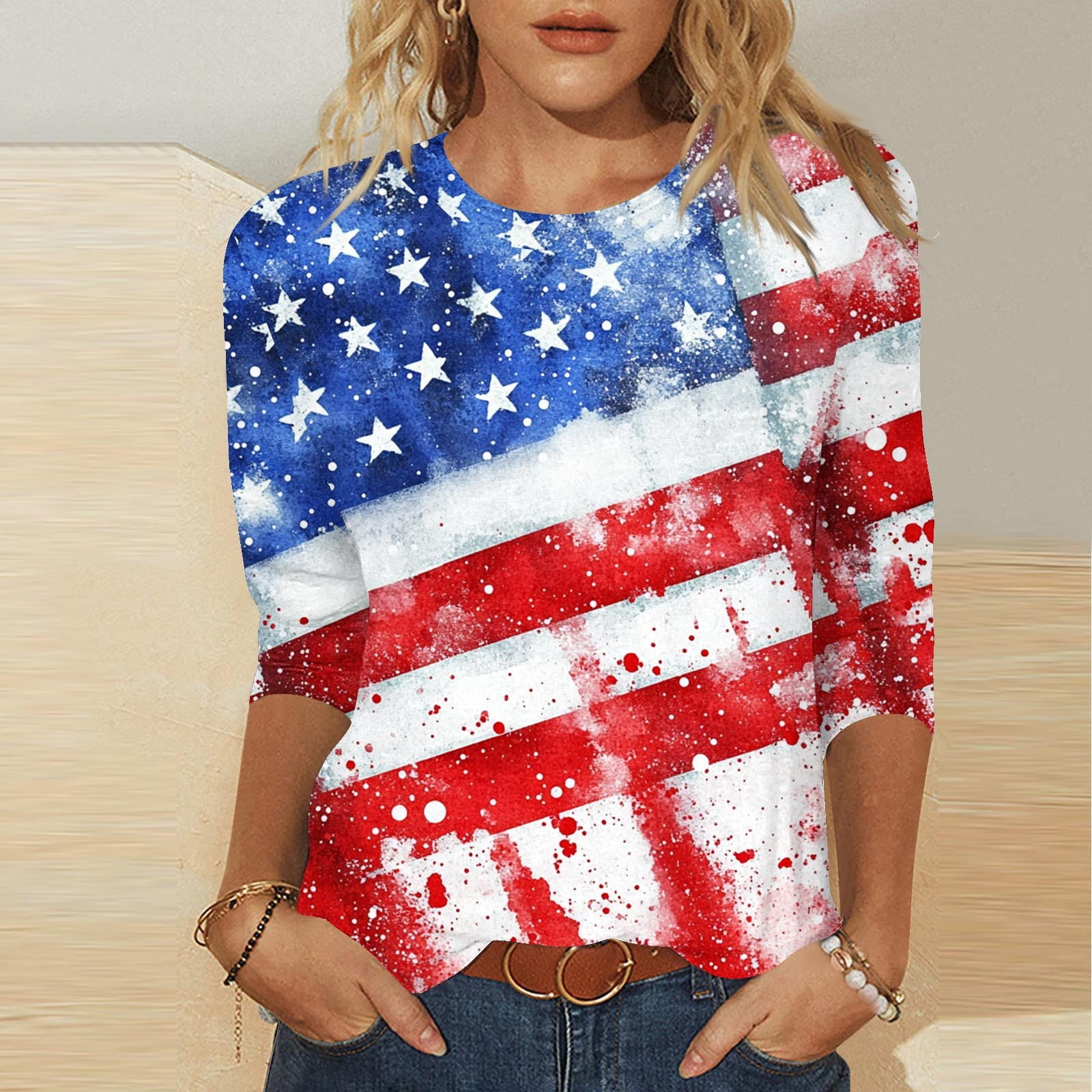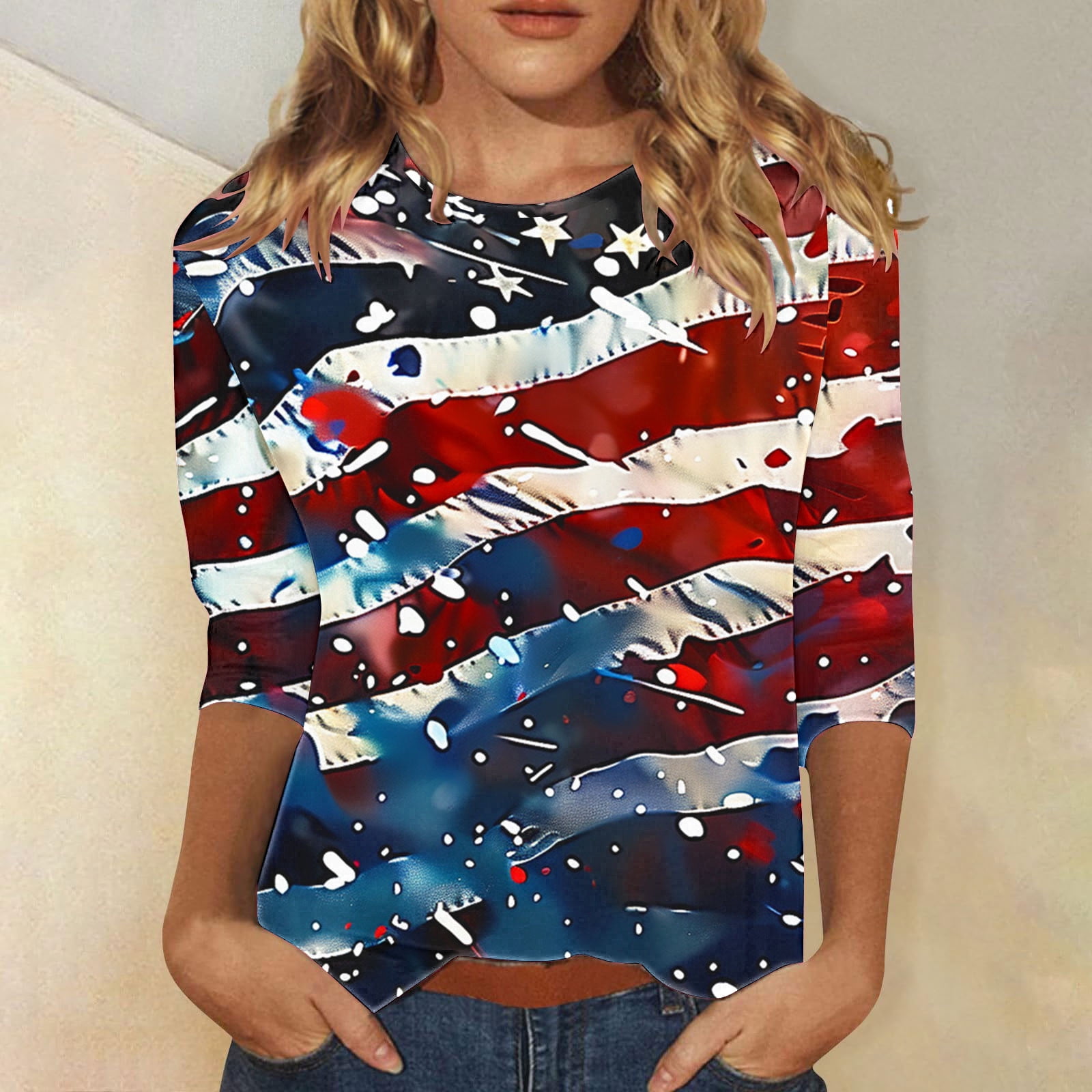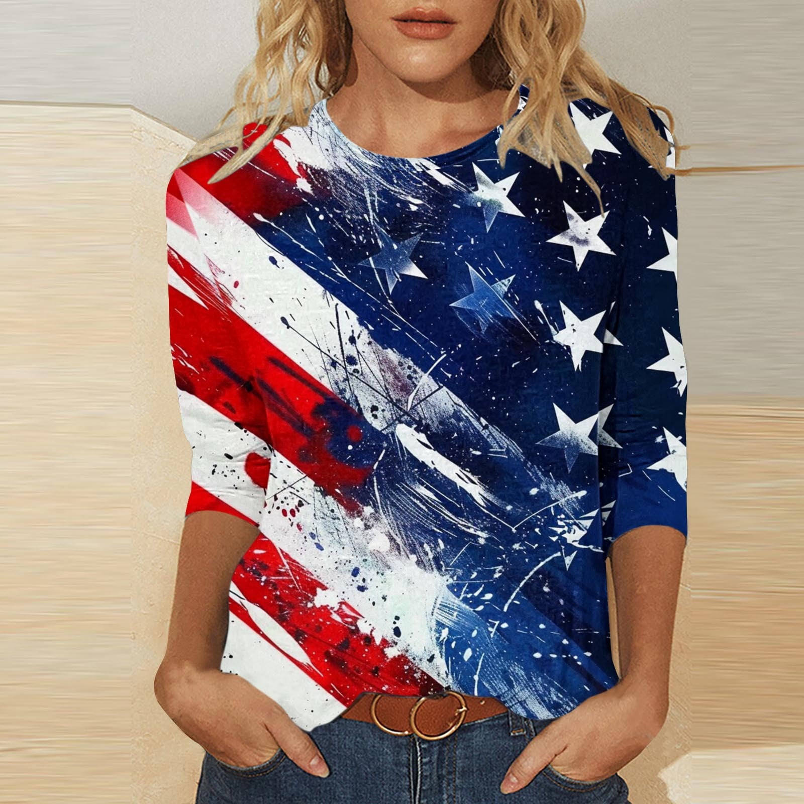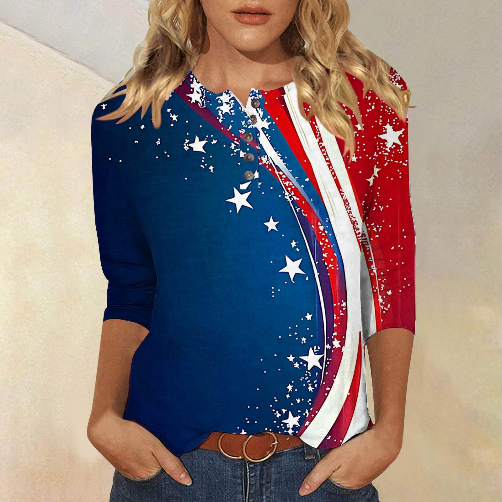 Qulqfy 3/4 Sleeve Ladies Tops Forth of July Blue National Pride 4th of